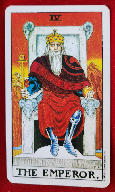 카드 속 황제는 붉은 로브를 걸치고 돌로 된 왕좌에 앉아 있습니다. 그의 주위에는 거친 바위산이 둘러싸여 있어요. 이는 부드러운 풍요가 아니라, 냉철하고 단단한 기반을 의미합니다. 황제의 한 손에는 권위를 상징하는 '홀'이, 다른 손에는 세상을 지배하는 '구'가 들려 있습니다. 그의 얼굴은 감정에 흔들리지 않는 강인함을 드러냅니다.